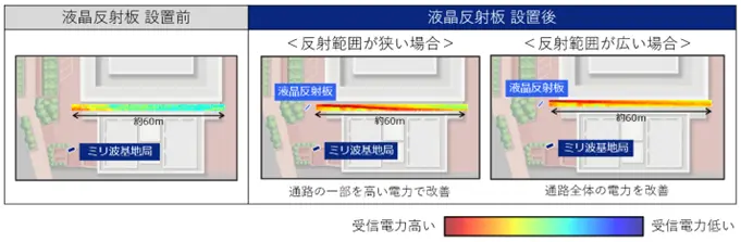 液晶反射板でミリ波を反射させ、屋外ビル間をエリア化する実証に成功