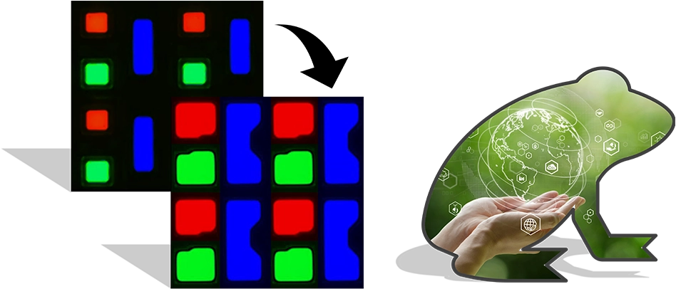 現在、OLEDディスプレイの量産には、ファインメタルマスク(FMM)を用いた有機材料の蒸着方式(以下「従来FMM方式」と いいます。)が広く採用されておりますが、eLEAPはFMMを全く使用せずにマスクレスで有機材料を基板上に蒸着させ、フォトリソ方式でOLED画素を形成したOLEDディスプレイです。