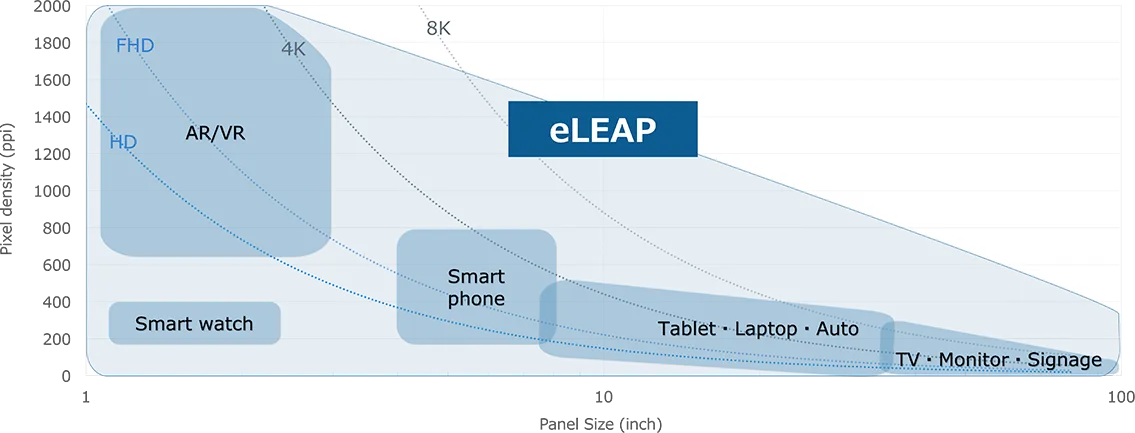 eLEAPは当社の確立した設計、プロセスノウハウを駆使することにより従来のメタルマスクを用いずに製造されたOLEDディスプレイです。OLEDディスプレイの薄型軽量、高コントラスト、高速応答などの特徴を備えつつ、従来のOLEDディスプレイに比べ発光面積の大幅な拡大を可能としました。市場で度々発生する焼付き課題を解決し、その加工精度の高さから高精細ディスプレイへの適用も期待されています。